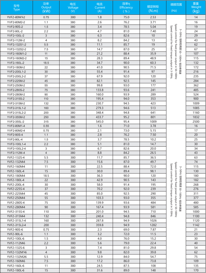 YVF2系列電機是可以采用變頻器供電的三相異步電動機,是電機節能的一種典型應用,采用特殊的絕緣系統吏其能適用于變頻器供電系統,一般額定電壓380V,頻率50Hz,5~50Hz為恒轉矩,50~100Hz為恒功率,也可根據用戶要求確定額定點的電壓和頻率,防護等級IP55、冷卻方式IC416、安裝方式符合IEC和DIN標準。